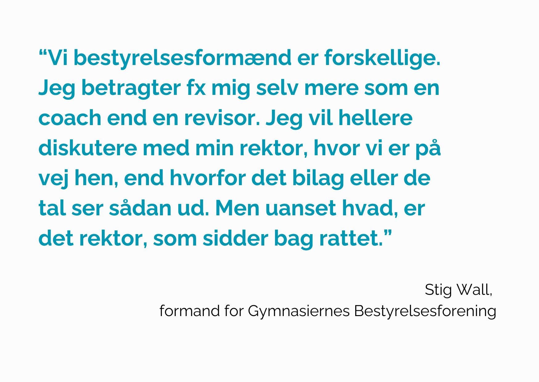 ”Sparring med rektor. Man kan ikke bare komme og sparke døren ind til rektor som bestyrelsesformand, så har man misforstået sin rolle. Men hvis du markerer, at ’hej, jeg er her’, spørger pænt og vinder rektors tillid, så kan I få et partnerskab, hvor I reelt arbejder sammen. Vi bestyrelsesformænd er forskellige. Jeg betragter fx mig selv mere som en coach end en revisor. Jeg vil hellere diskutere med min rektor, hvor vi er på vej hen, end hvorfor det bilag eller de tal ser sådan ud. Men uanset hvad, er det rektor, som sidder bag rattet.”