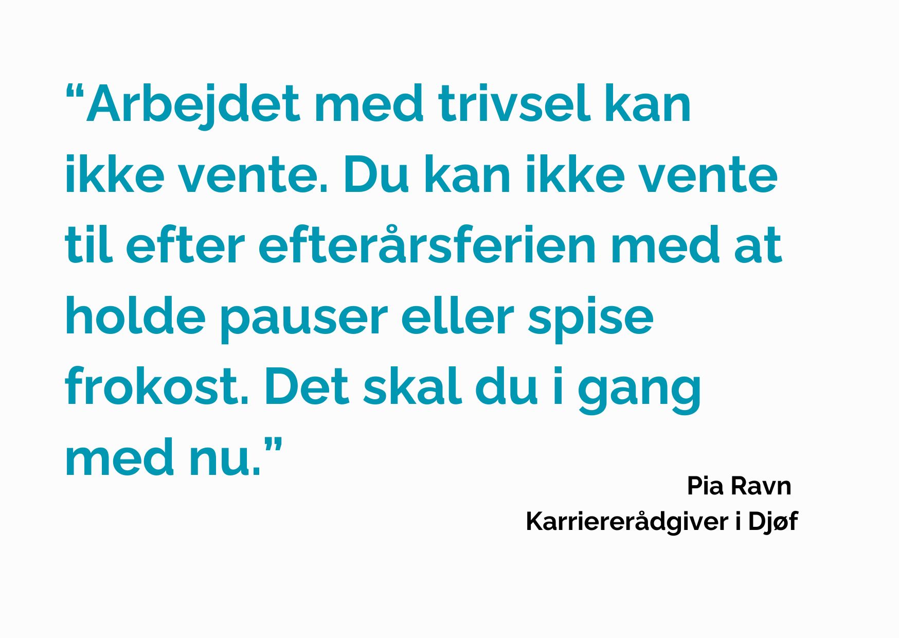 ”Du kan ikke kigge på mål og resultater uden også at kigge på trivsel. Og det gælder fra dag ét. Arbejdet med trivsel kan ikke vente. Du kan ikke vente til efter efterårsferien med at holde pauser eller spise frokost. Det skal du i gang med nu,” siger Pia Ravn.