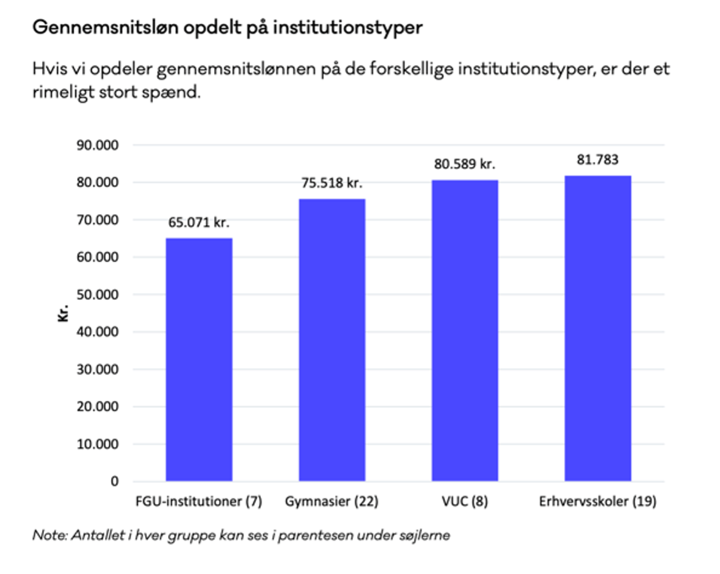 Der er stor forskel på, hvor meget den øverste leder tjener på de forskellige typer skoler. Øverste leder af en FGU-institution tjener i gennemsnit 65.071 kroner og en gymnasierektor tjener i gennemsnit 75.518 kroner mens topledere på VUC’erne i gennemsnit tjener 80.589 kroner om måneden og direktører på erhvervsskoler i gennemsnit får 81.783 kroner.